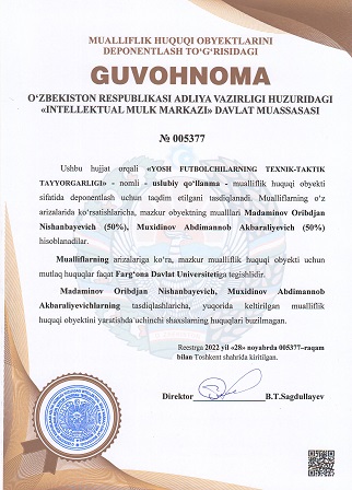 | 4722 | №005377 | Uslubiy qo‘llanma - «Yosh futbolchilarning texnik-taktik tayyorgarligi» | Madaminov Oribdjan Nishanbayevich (50%), Muxidinov Abdimannob Akbaraliyevich (50%) | Farg‘ona Davlat Universiteti | 11/28/2022 | ![]() |