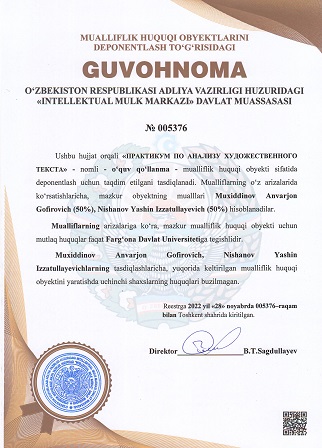 | 4723 | №005376 | O‘quv qo‘llanma - «Практикум по анализу художественного текста» | Muxiddinov Anvarjon Gofirovich (50%), Nishanov Yashin Izzatullayevich (50%) | Farg‘ona Davlat Universiteti | 11/28/2022 | ![]() |