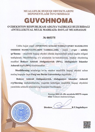 | 4724 | №005375 | O‘quv - uslubiy qo‘llanma - «Sportning kurash turidan sport maxoratini oshirish mashg‘ulotlarini tashkillash» | Bokiyev Ashirali Abdiganiyevich (50%), Abduganiyev Iskandar Ashurali o‘g‘li (50%) | Farg‘ona Davlat Universiteti | 11/28/2022 | ![]() |