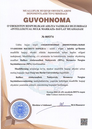 | 4725 | №005374 | O‘quv - uslubiy qo‘llanma - «Обыкновенные дифференциальные уравнения высшего порядка» | Rafikov Abdurasulbek Nabiyevich (50%), Ikramova Nargiza Sayidakbarovna (50%) | Farg‘ona Davlat Universiteti | 11/25/2022 | ![]() |