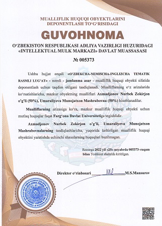 | 4726 | №005373 | Jamlanma asar - «O’ZBEKCHA-NEMISCHA-INGLIZCHA TEMATIK RASMLI LUG’AT» | Axmadjonov Nurbek Zokirjon o’g’li (50%), Umaraliyeva Munojatxon Mashrabovna (50%) | Farg‘ona Davlat Universiteti | 11/25/2022 | ![]() |