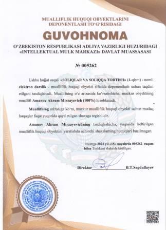 | 4837 | №005262 | Elektron darslik - "SSOLIQLAR VA SOLIQQA TORTISH" (4-qism) | Amanov Akram Mirzayevich (100%) | Amanov Akram Mirzayevich | 11/15/2022 | ![]() |