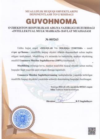 | 4838 | №005261 | Darslik - "SOLIQ MA‘MURCHILIGI" | Berdiyeva Uguloy Abduraxmanovna (100%) | Berdiyeva Uguloy Abduraxmanovna | 11/15/2022 | ![]() |
