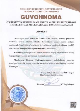 | 4835 | №005264 | Uslubiy qo‘llanma - "PSIXODIAGNOSTIKA" | Abdullayeva Ranajon Matyoqubovna (100%) | Abdullayeva Ranajon Matyoqubovna | 11/15/2022 | ![]() |