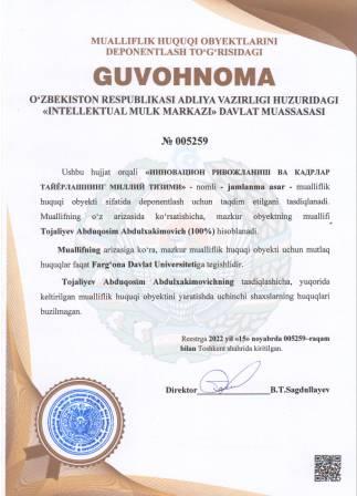 | 4840 | №005259 | Jamlanma asar - "ИННОВАЦИОН РИВОЖЛАНИШ ВА КАДРЛАР ТАЙЁРЛАШНИНГ МИЛЛИЙ ТИЗИМИ" | Tojaliyev Abduqosim Abdulxakimovich (100%) | Farg‘ona Davlat Universiteti | 11/15/2022 | ![]() |
