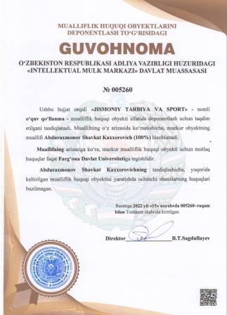 | 4839 | №005260 | O‘quv qo‘llanma - "JISMONIY TARBIYA VA SPORT" | Abduraxmonov Shavkat Kaxxorovich (100%) | Farg‘ona Davlat Universiteti | 11/15/2022 | ![]() |