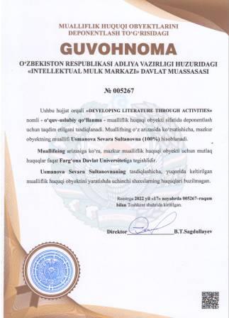 | 4832 | №005267 | O‘quv - uslubiy qo‘llanma -"DEVELOPING LITERATURE THROUGH ACTIVITIES" | Usmanova Sevara Sultanovna (100%) | Farg‘ona Davlat Universiteti | 11/17/2022 | ![]() |
