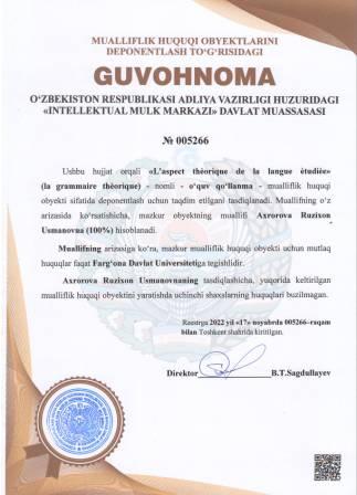 | 4833 | №005266 | O‘quv qo‘llanma - "L’aspect thѐorique de la langue ѐtudiѐe" (la grammaire thѐorique) | Axrorova Ruzixon Usmanovna (100%) | Farg‘ona Davlat Universiteti | 11/17/2022 | ![]() |