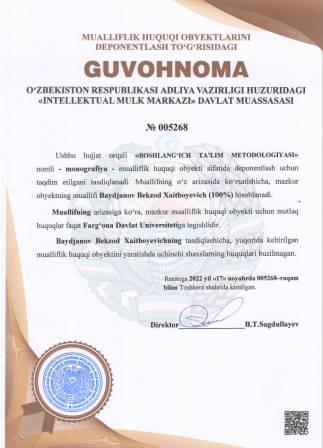 | 4831 | №005268 | Monografiya - "BOSHLANG‘ICH TA’LIM METODOLOGIYASI" | Baydjanov Bekzod Xaitboyevich (100%) | Farg‘ona Davlat Universiteti | 11/17/2022 | ![]() |