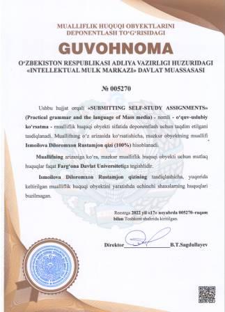 | 4829 | №005270 | O‘quv - uslubiy ko‘rsatma -"SUBMITTING SELF-STUDY ASSIGNMENTS" (Practical grammar and the language of Mass media) | Ismoilova Diloromxon Rustamjon qizi (100%) | Farg‘ona Davlat Universiteti | 11/17/2022 | ![]() |