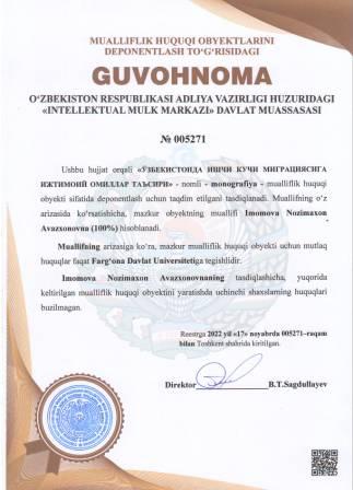 | 4828 | №005271 | Monografiya - "ЎЗБЕКИСТОНДА ИШЧИ КУЧИ МИГРАЦИЯСИГА ИЖТИМОИЙ ОМИЛЛАР ТАЪСИРИ" | Imomova Nozimaxon Avazxonovna (100%) | Farg‘ona Davlat Universiteti | 11/17/2022 | ![]() |