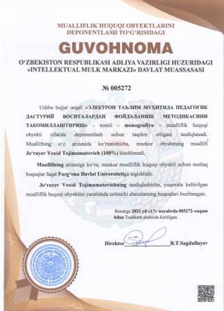 | 4827 | №005272 | Monografiya - "ЭЛЕКТРОН ТАЪЛИМ МУҲИТИДА ПЕДАГОГИК ДАСТУРИЙ ВОСИТАЛАРДАН ФОЙДАЛАНИШ МЕТОДИКАСИНИ ТАКОМИЛЛАШТИРИШ" | Jo‘rayev Voxid Tojimamatovich (100%) | Farg‘ona Davlat Universiteti | 11/17/2022 | ![]() |