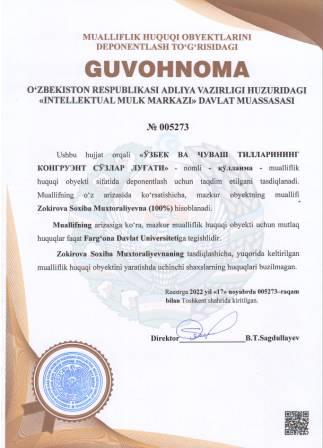 | 4826 | №005273 | Qo‘llanma -"ЎЗБЕК ВА ЧУВАШ ТИЛЛАРИНИНГ КОНГРУЭНТ СЎЗЛАР ЛУҒАТИ" | Zokirova Soxiba Muxtoraliyevna (100%) | Farg‘ona Davlat Universiteti | 11/17/2022 | ![]() |