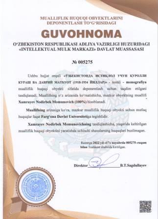 | 4824 | №005275 | Monografiya - "ЎЗБЕКИСТОНДА ИСТИҚЛОЛ УЧУН ҚУРОЛЛИ КУРАШ ВА ДАВРИЙ МАТБУОТ (1918-1934 ЙИЛЛАР)" | Xamrayev Nodirbek Momunovich (100%) | Farg‘ona Davlat Universiteti | 11/17/2022 | ![]() |
