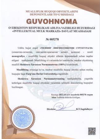 | 4821 | №005278 | Monografiya - "ТИЛНИНГ ЛИНГВОСЕМИОТИК СТРУКТУРАСИ" (семантик-сигматик, синтактик-прагматик аспект асосида) | Shokirova Xavasxon Nurmamatovna (100%) | Farg‘ona Davlat Universiteti | 11/17/2022 | ![]() |