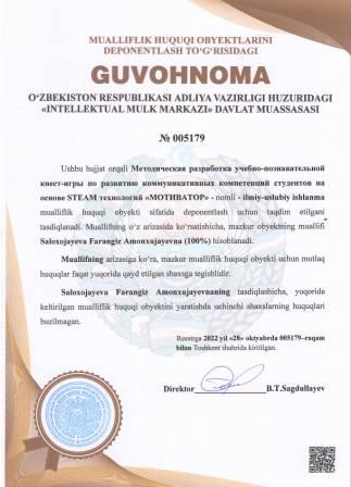 | 4920 | №005179 | Ilmiy - uslubiy ishlanma - Методическая разработка учебно-познавательной квест-игры по развитию коммуникативных компетенций студентов на основе STEAM технологий "МОТИВАТОР" " | Saloxojayeva Farangiz Amonxujayevna (100%) | Saloxojayeva Farangiz Amonxujayevna | 10/28/2022 | ![]() |