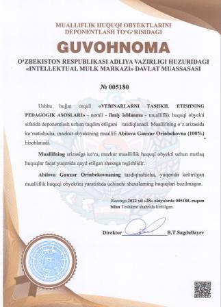 | 4919 | №005180 | Ilmiy ishlanma - "VEBINARLARNI TASHKIL ETISHNING PEDAGOGIK ASOSLARI" | Abilova Gauxar Orinbekovna (100%) | Abilova Gauxar Orinbekovna | 10/28/2022 | ![]() |