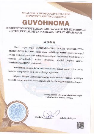 | 4918 | №005181 | O‘quv - uslubiy qo‘llanma - «MAKTABGACHA TA’LIM TASHKILOTIDA TEXNOLOGIK TA’LIM» | Aliyeva Xosiyat Xusniddinovna (100%) | Aliyeva Xosiyat Xusniddinovna | 11/01/2022 | ![]() |