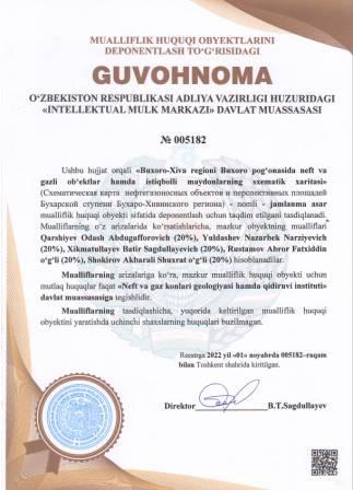 | 4917 | №005182 | Jamlanma asar - "Buxoro-Xiva regioni Buxoro pog‘onasida neft va gazli ob‘ektlar hamda istiqbolli maydonlarning sxematik xaritasi" (Схематическая карта нефтегазоносных объектов и перспективных площадей Бухарской ступени Бухаро-Хивинского региона) | Qarshiyev Odash Abdugafforovich (20%), Yuldashev Nazarbek Narziyevich (20%), Xikmatullayev Batir Sagdullayevich (20%), Rustamov Abror Fatxiddin o‘g‘li (20%), Shokirov Akbarali Shuxrat o‘g‘li (20%) | Neft va gaz konlari geologiyasi hamda qidiruvi instituti» davlat muassasasi | 11/01/2022 | ![]() |