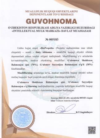 | 4916 | №005183 | Ilmiy ishlanma - "BioPropolis" (Propolis mahsulotidan maz ishlab chiqarish) | G‘ulomova Shahloxon Rahmonjon qizi (70%), G‘ulomov Sayyodjon Rahmonjon o‘g‘li (30%) | G‘ulomova Shahloxon Rahmonjon qizi, G‘ulomov Sayyodjon Rahmonjon o‘g‘li | 11/01/2022 | ![]() |