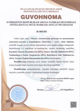| 4914 | №005185 | Ilmiy ishlanma - "Модель оптимизации расходов на организацию комплаенс-закупок в акционерных обществах" | Karakulov Farxod Zaypudinovich (20%), Umarov Baxodir Sultonovich (20%), Tashkenbayeva Zarina Ulugbekovna (20%), Batirbekova Aida Makkamovna (20%), Turayev Nurbek Muxammadovich (20%) | Karakulov Farxod Zaypudinovich, Umarov Baxodir Sultonovich, Tashkenbayeva Zarina Ulugbekovna, Batirbekova Aida Makkamovna, Turayev Nurbek Muxammadovich | 11/02/2022 | ![]() |