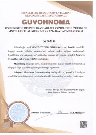 | 4913 | №005186 | Darslik - «UMUMIY PEDAGOGIKA» | Salayeva Muxabbat Saburovna (100%) | Salayeva Muxabbat Saburovna | 11/07/2022 | ![]() |