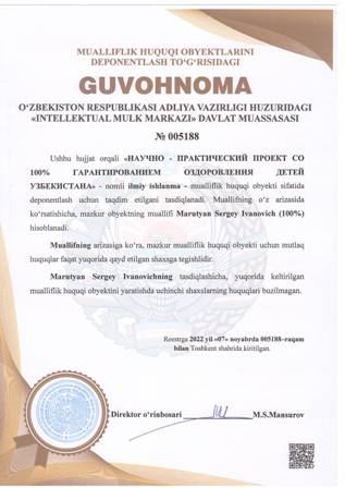 | 4911 | №005188 | Ilmiy ishlanma - «НАУЧНО - ПРАКТИЧЕСКИЙ ПРОЕКТ СО 100% ГАРАНТИРОВАНИЕМ ОЗДОРОВЛЕНИЯ ДЕТЕЙ УЗБЕКИСТАНА» | Marutyan Sergey Ivanovich (100%) | Marutyan Sergey Ivanovich | 11/07/2022 | ![]() |