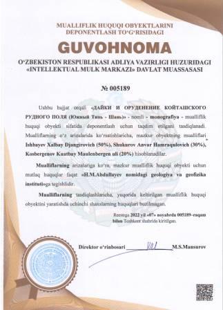 | 4910 | №005189 | Monografiya - "ДАЙКИ И ОРУДЕНЕНИЕ КОЙТАШСКОГО РУДНОГО ПОЛЯ (Южный Тянь - Шань)" | Ishbayev Xalbay Djangirovich (50%), Shukurov Anvar Hamraqulovich (30%), Kosbergenov Kuatbay Maulenbergen uli (20%) | H.M.Abdullayev nomidagi geologiya va geofizika instituti | 11/07/2022 | ![]() |