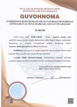 | 4909 | №005190 | Matnsiz musiqa asari - "НАЙЛАЙИН" | Axmedov Rafik Maxsudovich (100%) | Axmedov Rafik Maxsudovich | 11/07/2022 | ![]() |