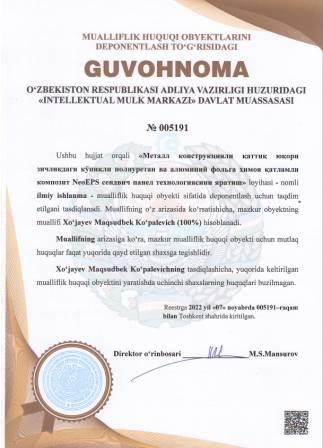 | 4908 | №005191 | Ilmiy ishlanma - "Металл конструкцияли қаттиқ юқори зичликдаги кўпикли полиуретан ва алюминий фольга ҳимоя қатламли композит NeoEPS сендвич панел технологиясини яратиш" loyihasi | Xo‘jayev Maqsudbek Ko‘palevich (100%) | Xo‘jayev Maqsudbek Ko‘palevich | 11/07/2022 | ![]() |
