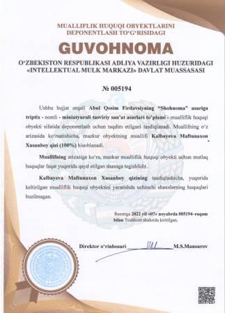 | 4905 | №005194 | Miniatyurali tasviriy san’at asarlari to’plami -"Abul Qosim Firdavsiyning “Shohnoma” asariga triptix" | Kalbayeva Maftunaxon Xusanboy qizi (100%) | Kalbayeva Maftunaxon Xusanboy qizi | 11/07/2022 | ![]() |