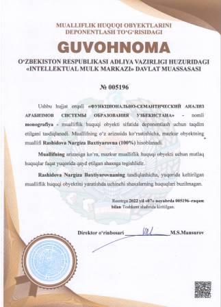 | 4903 | №005196 | Monografiya - "ФУНКЦИОНАЛЬНО-СЕМАНТИЧЕСКИЙ АНАЛИЗ АРАБИЗМОВ СИСТЕМЫ ОБРАЗОВАНИЯ УЗБЕКИСТАНА" | Rashidova Nargiza Baxtiyarovna (100%) | Rashidova Nargiza Baxtiyarovna | 11/07/2022 | ![]() |
