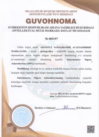 | 4902 | №005197 | Monografiya - "МАҲМУД ЗАМАХШАРИЙ АСАРЛАРИНИНГ МАНБАЛАРИ" | Sulaymonova Nigora Askaraliyevna (100%) | Sulaymonova Nigora Askaraliyevna (100%) | 11/07/2022 | ![]() |