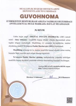 | 4901 | №005198 | Ilmiy ishlanma - "DIGITAL INSTANT FEEDBACK" (DIF) metodi | To‘xtayeva Fazilat Shavkat qizi (100%) | To‘xtayeva Fazilat Shavkat qizi | 11/07/2022 | ![]() |