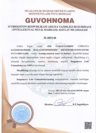 | 4959 | №005140 | Trening ssenariy asari va dasturi - "ЁШ РАҲБАРЛАРНИНГ СТРЕССГА БАРДОШЛИЛИКНИ ШАКЛЛАНТИРИШНИНГ ИЖТИМОИЙ-ПСИХОЛОГИК ХУСУСИЯТЛАРИ" | Inagamova Lola Usmanbekovna (100%) | Inagamova Lola Usmanbekovna | 10/13/2022 | ![]() |