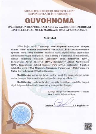 | 4958 | №005141 | Ilmiy ishlanma - Транспорт воситаларидан чиқадиган углерод газини тутиб қолувчи инновацион "ЭКО-KAALINK" технологиясини яратиш | Abdullayev Ilyos Sultanovich (20%), Palvaniyazov Anvar Anatovich (15%), Raximbayev Akmal Azatboyevich (15%), Kadamboyev Behzod Shuxrat o‘g‘li (20%), Saidamatov Yusufjon Jalaliddin o‘g‘li (10%), Otajonova Shaxrizoda Farxod qizi (10%), Farxodova Nafisa Davronbek qizi (10%) | Abdullayev Ilyos Sultanovich, Palvaniyazov Anvar Anatovich, Raximbayev Akmal Azatboyevich, Kadamboyev Behzod Shuxrat o‘g‘li, Saidamatov Yusufjon Jalaliddin o‘g‘li, Otajonova Shaxrizoda Farxod qizi, Farxodova Nafisa Davronbek qizi | 10/14/2022 | ![]() |