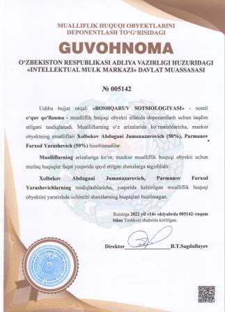 | 4957 | №005142 | O‘quv qo‘llanma - "BOSHQARUV SOTSIOLOGIYASI" | Xolbekov Abdugani Jumanazarovich (50%), Parmanov Farxod Yarashevich (50%) | Xolbekov Abdugani Jumanazarovich, Parmanov Farxod Yarashevich | 10/14/2022 | ![]() |