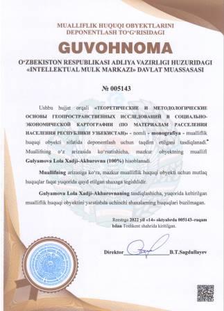 | 4956 | №005143 | Monografiya - "ТЕОРЕТИЧЕСКИЕ И МЕТОДОЛОГИЧЕСКИЕ ОСНОВЫ ГЕОПРОСТРАНСТВЕННЫХ ИССЛЕДОВАНИЙ В СОЦИАЛЬНО-ЭКОНОМИЧЕСКОЙ КАРТОГРАФИИ (ПО МАТЕРИАЛАМ РАССЕЛЕНИЯ НАСЕЛЕНИЯ РЕСПУБЛИКИ УЗБЕКИСТАН)" | Gulyamova Lola Xadji-Akbarovna (100%) | Gulyamova Lola Xadji-Akbarovna | 10/14/2022 | ![]() |