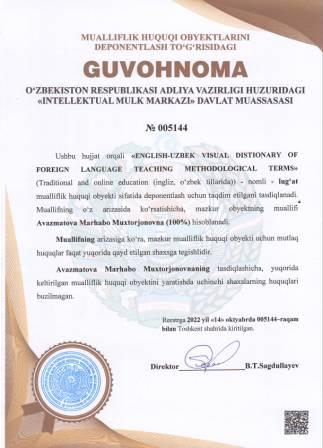 | 4955 | №005144 | Lug‘at - "ENGLISH-UZBEK VISUAL DISTIONARY OF FOREIGN LANGUAGE TEACHING METHODOLOGICAL TERMS" (Traditional and online education (ingliz, o‘zbek tillarida)) | Avazmatova Marhabo Muxtorjonovna (100%) | Avazmatova Marhabo Muxtorjonovna (100%) | 10/14/2022 | ![]() |