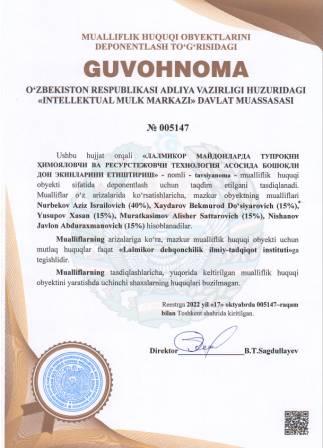 | 4952 | №005147 | Tavsiyanoma - "ЛАЛМИКОР МАЙДОНЛАРДА ТУПРОҚНИ ҲИМОЯЛОВЧИ ВА РЕСУРСТЕЖОВЧИ ТЕХНОЛОГИЯ АСОСИДА БОШОҚЛИ ДОН ЭКИНЛАРИНИ ЕТИШТИРИШ" | Nurbekov Aziz Israilovich (40%), Xaydarov Bekmurod Do‘siyarovich (15%), Yusupov Xasan (15%), Muratkasimov Alisher Sattarovich (15%), Nishanov Javlon Abduraxmanovich (15%) | Lalmikor dehqonchilik ilmiy-tadqiqot instituti | 10/17/2022 | ![]() |