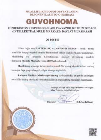 | 4950 | №005149 | Risola -"KEKSALIK VA MA’NAVIY MEROS" | Sodiqova Shohida Marhaboyevna (100%) | Sodiqova Shohida Marhaboyevna | 10/17/2022 | ![]() |