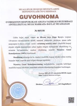 | 4949 | №005150 | Serialning ssenariy asari - "Асал ва Шодия ёхуд Қора Булут" (сериал 120-қисмга мўлжалланган бўлиб, маиший, романтик, детектив, драма каби жанрларни ўз ичига олган) | Niyazova Guzal Kamaljanovna (100%) | Niyazova Guzal Kamaljanovna | 10/17/2022 | ![]() |