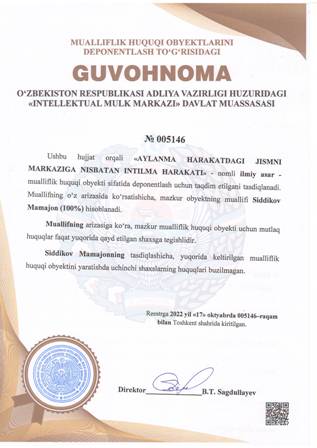 | 4953 | №005146 | Ilmiy asar - «AYLANMA HARAKATDAGI JISMNI MARKAZIGA NISBATAN INTILMA HARAKATI» | Siddikov Mamajon (100%) | Siddikov Mamajon | 10/17/2022 | ![]() |