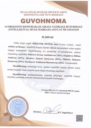 | 4954 | №005145 | Uslubiy qo’llanma - ORGANIK SINTEZ» fani (4 kurs, 2-qism) | Pulatova Feruza Azatbekovna (20%), Ergasheva Dilfuza Amilovna (20%), Abzalova Zumrat Jurayevna (20%), Olimova Manzura Ilxomovna (20%), Yaxshiyeva Yulduzxon Rustamovna (20%) | Pulatova Feruza Azatbekovna, Ergasheva Dilfuza Amilovna, Abzalova Zumrat Jurayevna, Olimova Manzura Ilxomovna, Yaxshiyeva Yulduzxon Rustamovna | 10/17/2022 | ![]() |