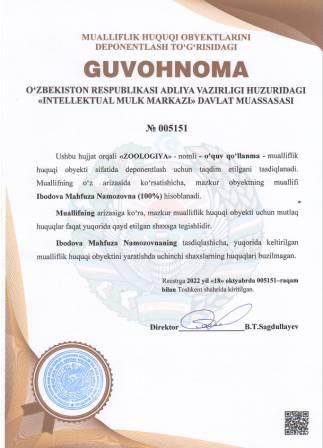 | 4948 | №005151 | O‘quv qo‘llanma - "ZOOLOGIYA" | Ibodova Mahfuza Namozovna (100%) | Ibodova Mahfuza Namozovna | 10/18/2022 | ![]() |