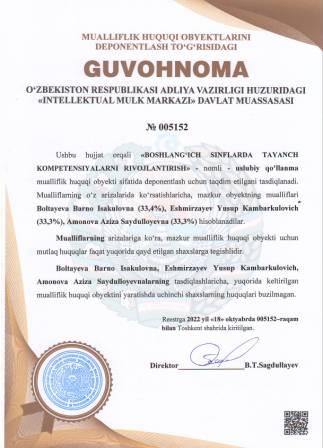 | 4947 | №005152 | Uslubiy qo‘llanma - "BOSHLANG‘ICH SINFLARDA TAYANCH KOMPETENSIYALARNI RIVOJLANTIRISH" | Boltayeva Barno Isakulovna (33,4%), Eshmirzayev Yusup Kambarkulovich (33,3%), Amonova Aziza Saydulloyevna (33,3%) | Boltayeva Barno Isakulovna, Eshmirzayev Yusup Kambarkulovich, Amonova Aziza Saydulloyevna | 10/18/2022 | ![]() |