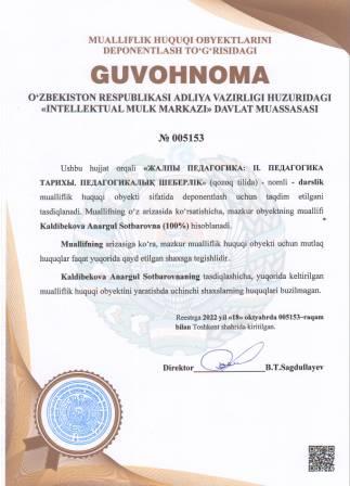 | 4946 | №005153 | Darslik - "ЖАЛПЫ ПЕДАГОГИКА: II. ПЕДАГОГИКА TAРИXЫ. ПЕДАГОГИКАЛЫҚ ШЕБЕРЛIK" (qozoq tilida) | Kaldibekova Anargul Sotbarovna (100%) | Kaldibekova Anargul Sotbarovna | 10/18/2022 | ![]() |