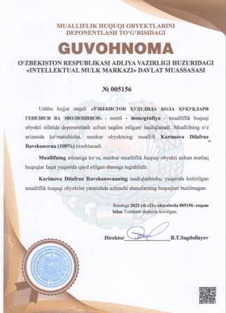 | 4943 | №005156 | Monografiya - "ЎЗБЕКИСТОН ҲУДУДИДА БОЛА ҲУҚУҚЛАРИ ГЕНЕЗИСИ ВА ЭВОЛЮЦИЯСИ" | Karimova Dilafruz Ravshanovna (100%) | Karimova Dilafruz Ravshanovna | 10/21/2022 | ![]() |