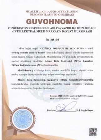 | 4999 | №005100 | Trening ssenariy asari va dasturi - "ЛОЙИҲА БОШҚАРУВИ АСОСЛАРИ" | Alimov Botu Babirovich (50%), Kamalova Dilfuza Xodjiakbarovna (50%) | Alimov Botu Babirovich, Kamalova Dilfuza Xodjiakbarovna | 09/30/2022 | ![]() |