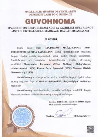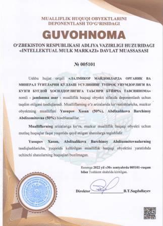 | 4995 | №005104 | Jamlanma asar - "ЛАЛМИКОР МАЙДОНЛАРДА АРПА ЕТИШТИРИШ БЎЙИЧА ТАВСИЯЛАР" | Mamatqulov Tursunqul (35%), Xoldorov Abdug‘afurjon Abdivaxobovich (30%), Usarov Zoxid Igamovich (30%), Xusanov Otabek Nematulla o‘g‘li (5%) | Lalmikor dehqonchilik ilmiy-tadqiqot instituti | 10/06/2022 | ![]() |